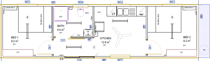 Designed for comfort and functionality, this 12m x 3m modular building features two generously sized bedrooms at opposite ends for added privacy. Centrally located is a fully equipped kitchen and bathroom, offering convenient shared amenities. There’s also ample space to include a dining table, making this module ideal for longer stays or shared living.